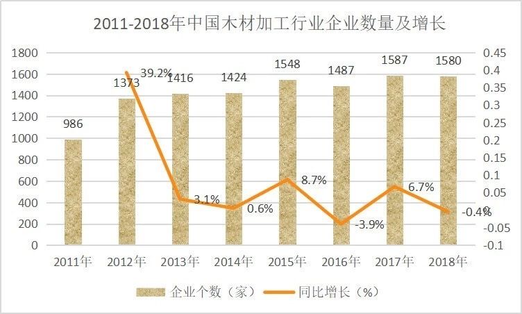 改革開放以來,經(jīng)過40年的發(fā)展,我國木材加工行業(yè)已經(jīng)取得長足發(fā)展,2018年銷售規(guī)模已達(dá)1999.35億元,規(guī)模以上企業(yè)數(shù)量達(dá)1580家。在此背景下,鋸材、木片、人造板、木制品等細(xì)分市場也有顯著發(fā)展。